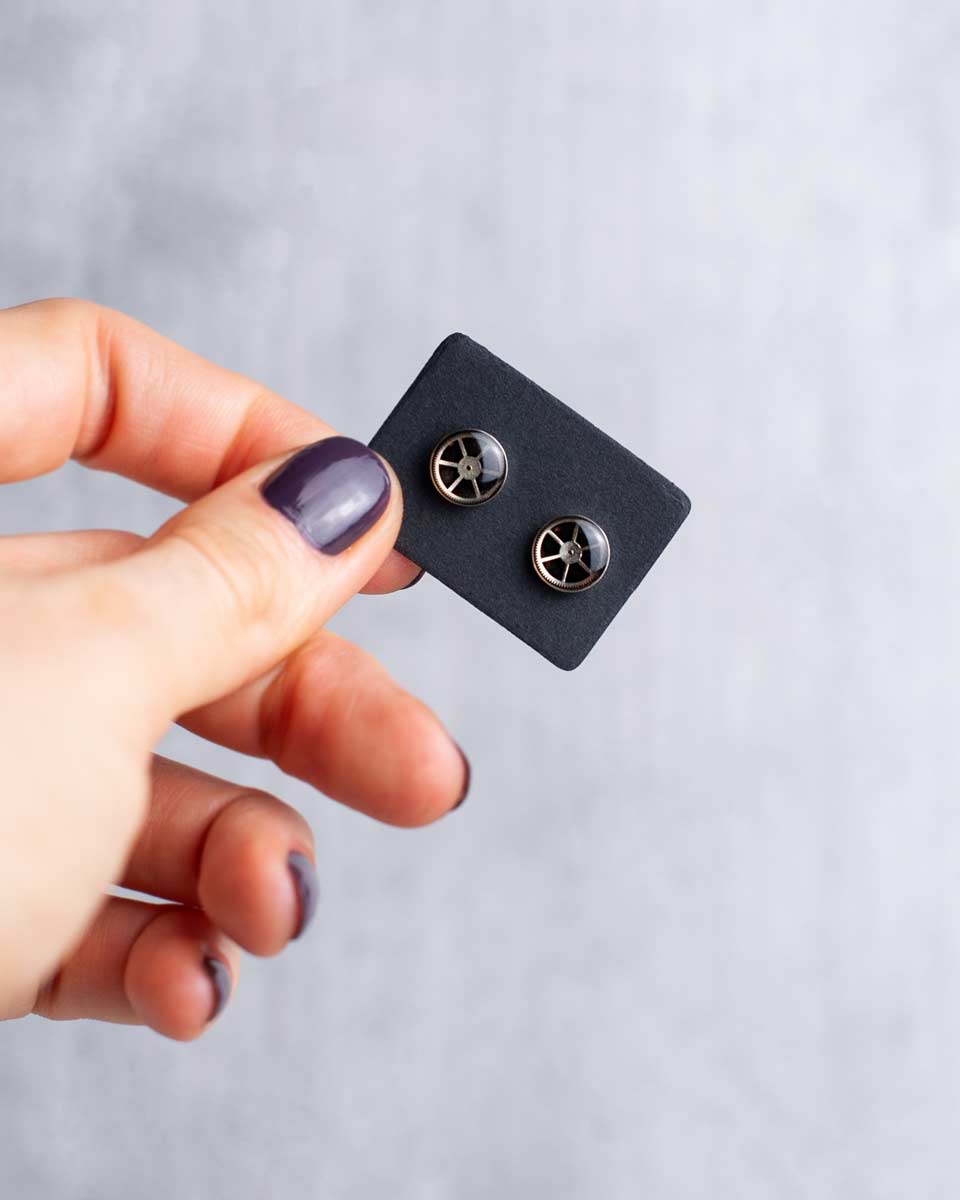 The Elemental collection embraces minimalist design that is simple, but far from basic. It’s steampunk stripped down to its elemental components: cogs and wheels. Each pair of minimalist steampunk earrings is meticulously handcrafted with high-quality stainless steel findings and genuine watch parts encased in crystal-clear epoxy resin. Thanks to their clean design, all Elemental pieces can be easily styled with other steampunk jewellery.