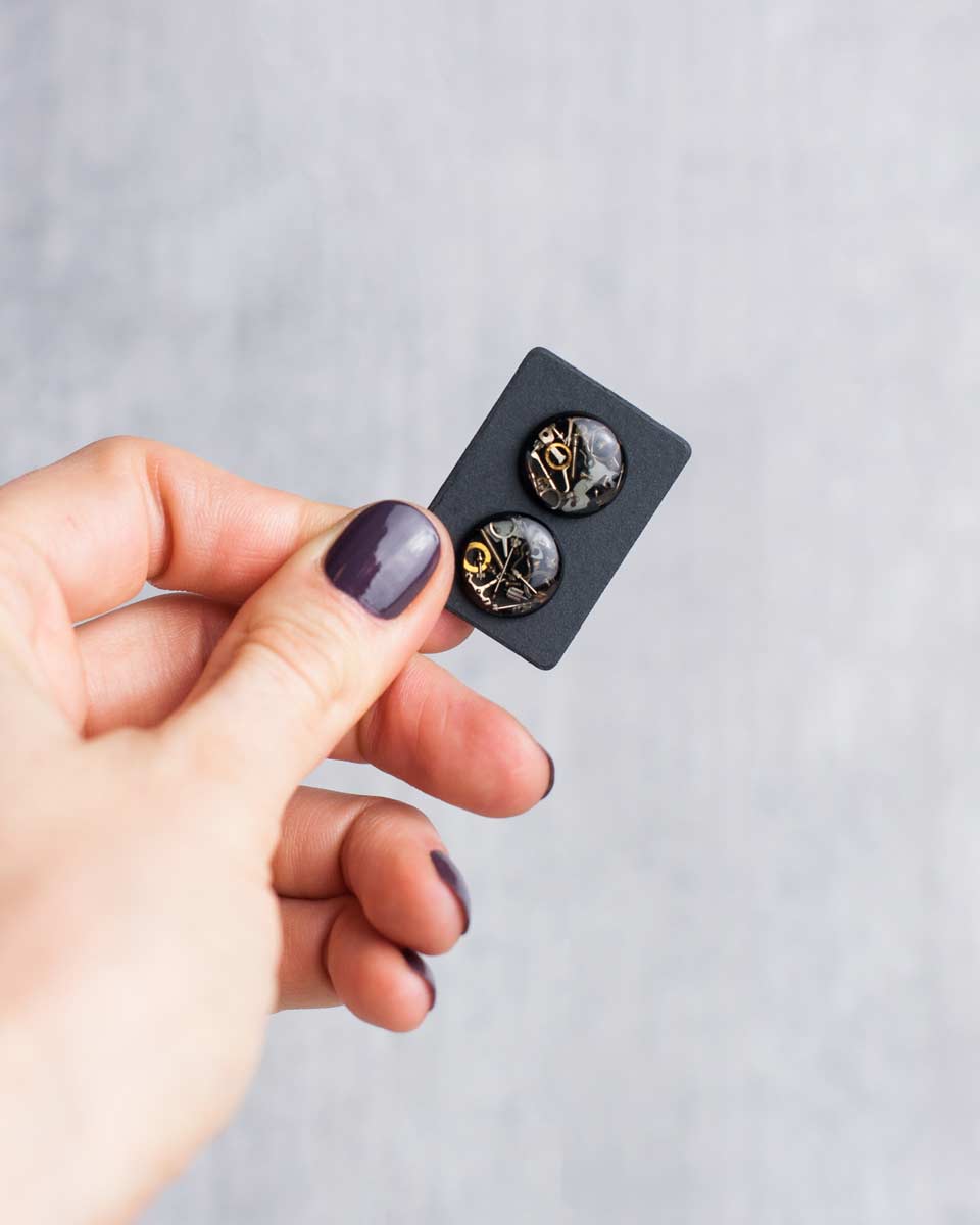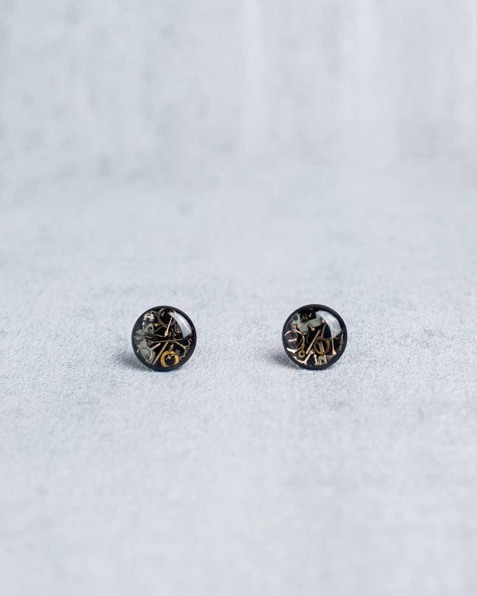 Handcrafted from reclaimed watch parts, these black steampunk studs add a spark of mechanical character to your style. Tiny gears, plates, bridges, and screws are arranged in structured chaos and sealed beneath clear, glossy resin.