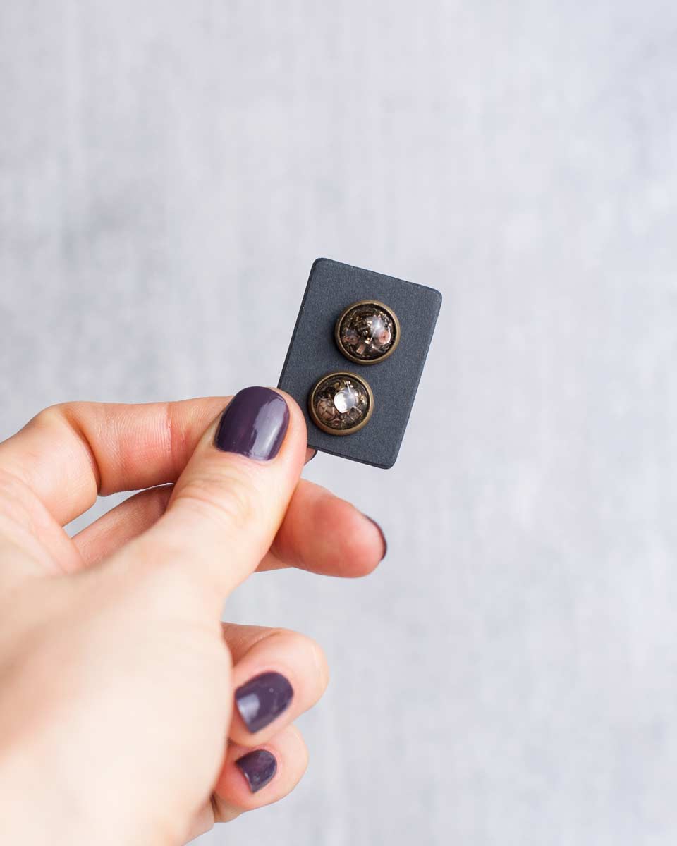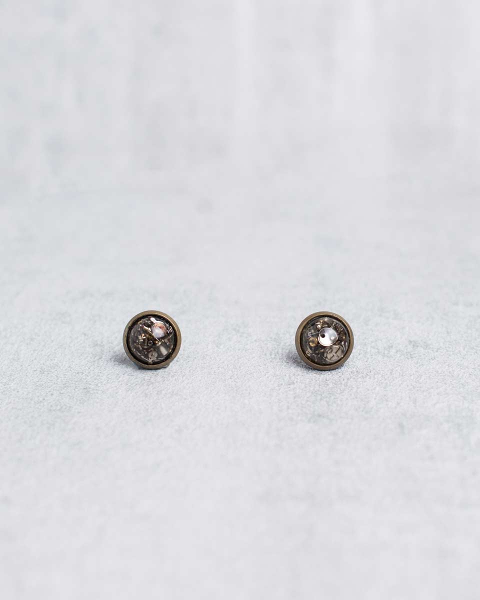 Handcrafted from reclaimed watch parts, these mini steampunk studs add a spark of mechanical character to your style. Tiny gears, plates, bridges, and screws are arranged in structured chaos and sealed beneath clear, glossy resin.