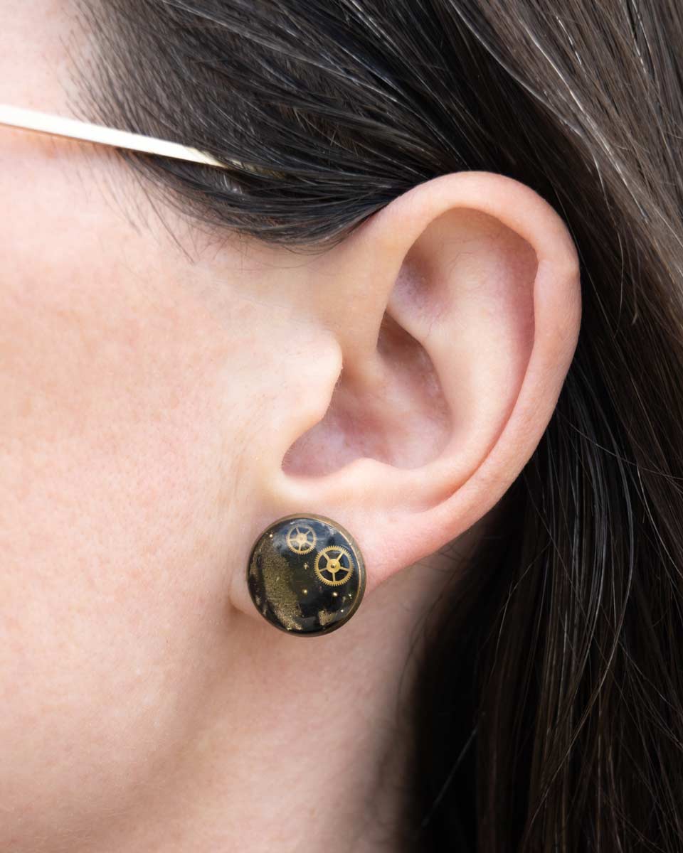 Set in a stainless steel bezel, each design is completely one of a kind. Whether you’re styling a steampunk outfit, adding an alternative twist to your daily wardrobe, or hunting for a distinctive handmade gift, these silver studs bring a bright industrial edge.