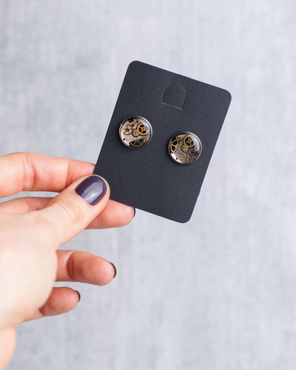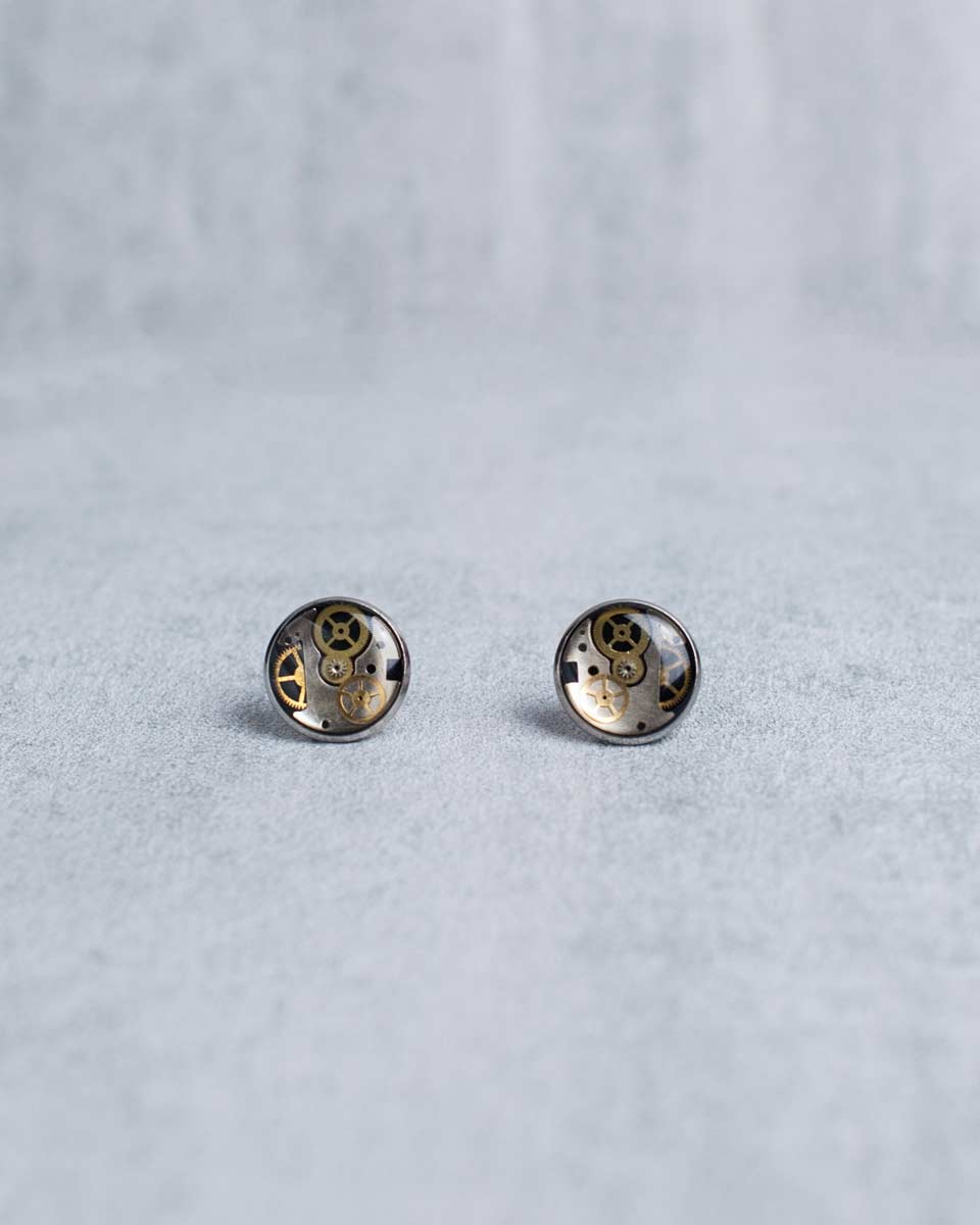 Handmade from reclaimed watch parts and sealed in crystal-clear resin, these silver steampunk stud earrings deliver a spark of edgy mechanical character. Every pair features a unique arrangement of cogs, plates, bridges, and screws, creating a tiny mechanical world captured inside a glossy dome.