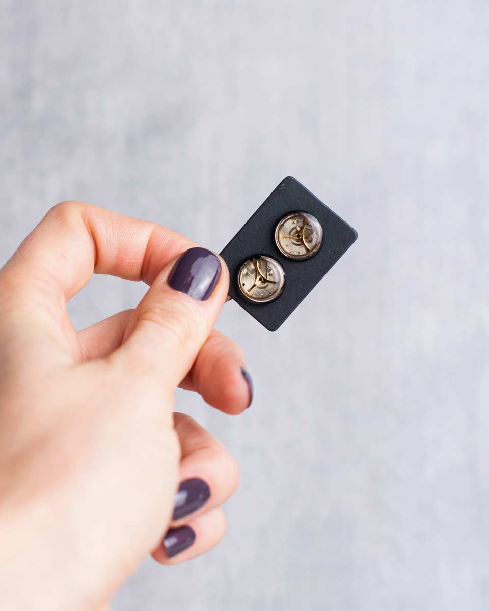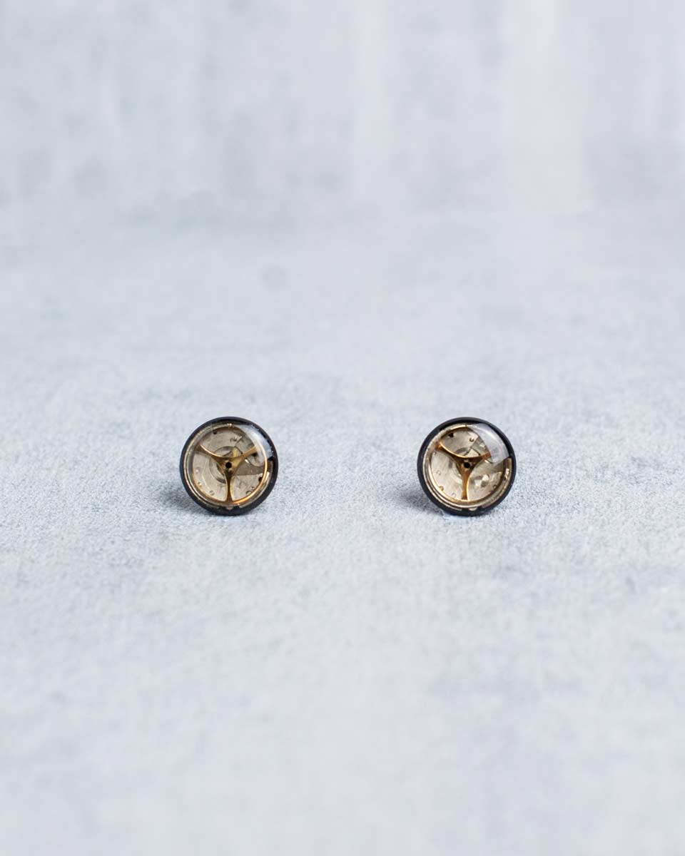 Handmade with authentic reclaimed watch parts, these steampunk stud earrings bring a mechanical punch to any outfit. Each pair is crafted with real watch components sealed under crystal-clear resin.
